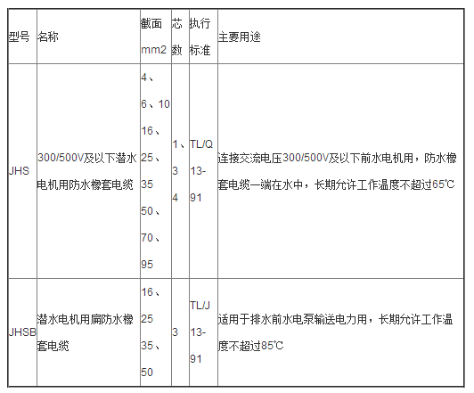 1、防水橡套電纜供交流電壓500V及以下的潛水電機上傳輸電能。電纜線芯長期允許工作溫度65℃。